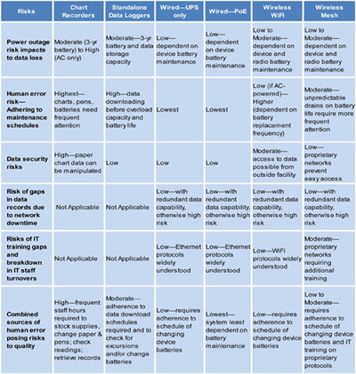 In part 1 of this article, we discussed the pros and cons of various systems for stand-alone monitoring instruments (e.g., chart recorders and data loggers) and wired networks, with and without power over Ethernet (POE). In the second part of this article, we will look at two types of wireless monitoring—Wi-Fi and mesh—and continue the discussion of the risk factors (figure 1) and costs of ownership (figure 2).