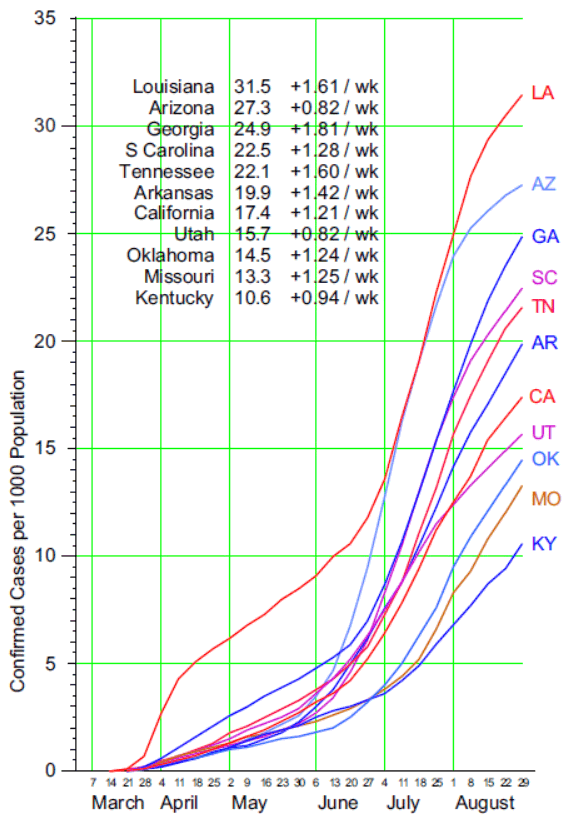 In order to have a frame of reference for understanding the progression of Covid-19 within the United States we will begin with graphs showing the progression in some other countries. The values plotted for each country are the cumulative number of confirmed cases of Covid-19 per thousand population. These values were computed at the end of each calendar week. When these weekly per capita values are plotted for each of the 26 weeks between March 1 and August 29 we end up with the running records shown in figure 1. These curves allow us to compare levels between countries and also to see how these levels are changing over time. In this way we can see where the pandemic is growing rapidly and where it has been slowed down.