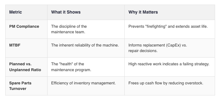 The data show that although PM compliance is at 95%, MTTR is spiking on the weekends because only one technician is on call. By presenting a report that shows exactly how much production revenue will be lost during those weekend hours, the manager can justify hiring two additional technicians.