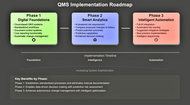 Phase 1: Digital foundations—Develop cloud-based QMS systems that provide the underpinnings for systematic change management. This includes standardized workflows, document control systems, and core reporting functionality.