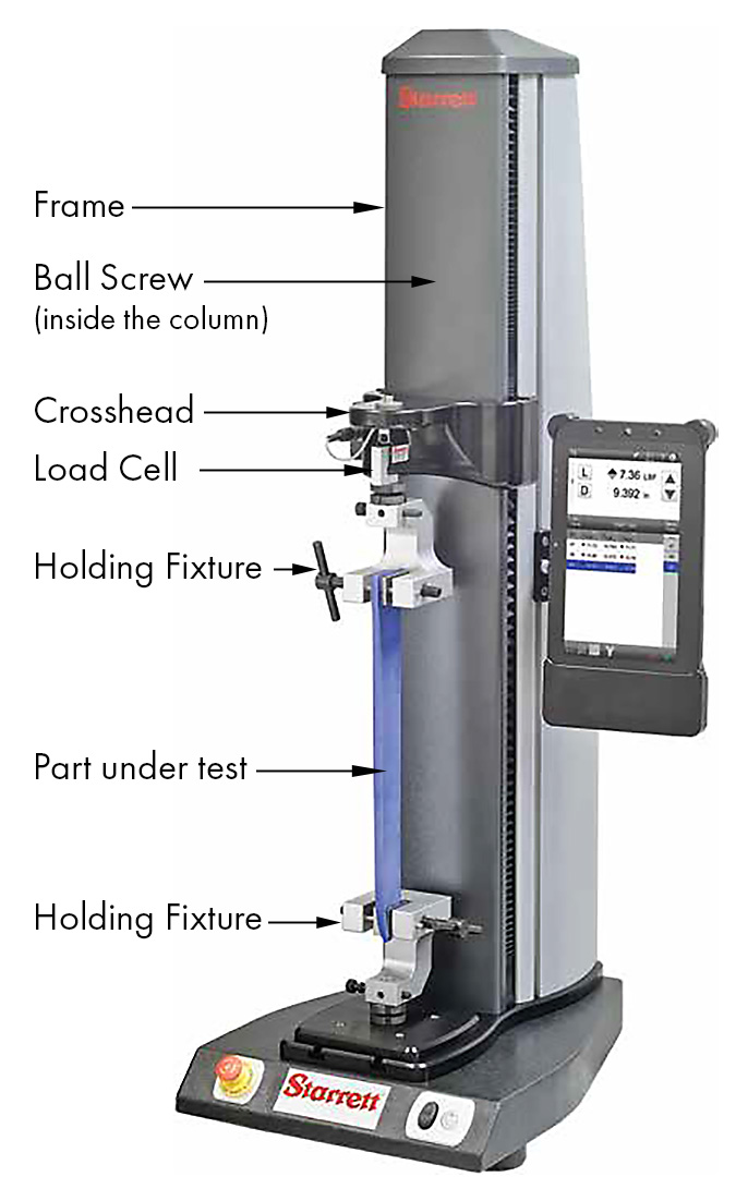 At it’s simplest, a force tester consists of a frame (stand), a motor that turns a ball screw, and a crosshead that moves up and down either pushing (compression) or pulling (tension) the part under test. The crosshead holds a load cell—an electromechanical device that converts force into an electrical signal, and some sort of gripper or fixture to hold or push against the part under test. The signal from the load cell is sent to a computer for processing and display.