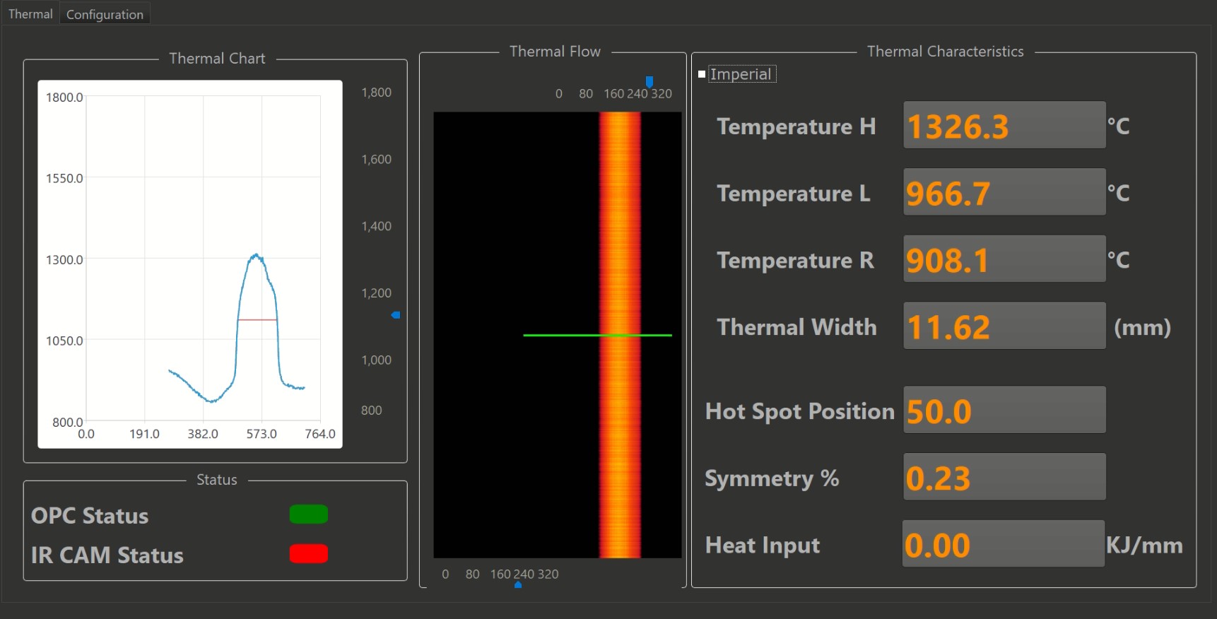A thermal inspection system measures the heat radiation coming from a weld seam. This data transfers into the software layer to convert the thermal data into a visual representation and calculated parameters. These parameters are then used to identify potential problems in the weld and improper mechanical setup.