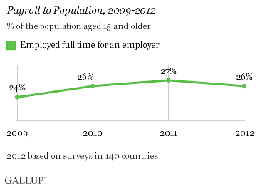 Twenty-six percent of the world’s adult population was employed full time for an employer in 2012, down slightly from 27 percent a year ago. This decline reverses the upward trend in Gallup’s Payroll to Population (P2P) measure since the height of the global recession in 2009.