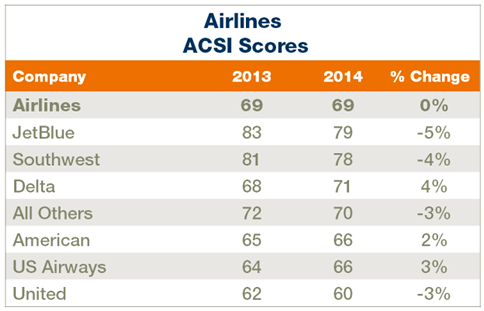 Passenger satisfaction is unchanged this year at an ACSI score of 69. Even though air travel has improved some over the years, only subscription TV, Internet service, and social media sites have lower levels of customer satisfaction in ACSI. Uncomfortable seating and poor in-flight service contribute most to the low scores.