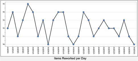 Thanks for your article explaining the use of Process Behavior Charts. However, the analysis needs to go a few steps farther. In your final chart, the parameters of UCL, LCL, and Mean are meaningless in this context. The first three data points and the last 17 points appear to come from the same process, while the data for 3/18 - 3/23 suggest a definite upset in the system. I suggest you replot the chart with centerlines and control limits for each of these populations, easily done with most software. Then, what lesson(s) can be learned from studying the points of 3/18 - 3/23? What happened? The true underlying process may be centered at 11.0 - 11.5. Obviously, the desired number of reworked items per day is zero, but the process "knows" NOTHING of your wants and desires (i.e., specs)! Next, one could work on the process and determine if the process goes "out of control" to the low side as a result.