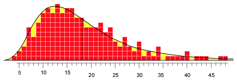 Some data analysts seek to generalize observational data by finding a probability model that fits the histogram. Since our histogram is skewed, we’ll want to use a skewed probability model to characterize the process. And a family of skewed distributions preferred by many statisticians is the family of lognormal distributions. If these data might be reasonably modeled by a lognormal distribution, we can use the descriptive statistics from the histogram to estimate the two parameters for the lognormal model.