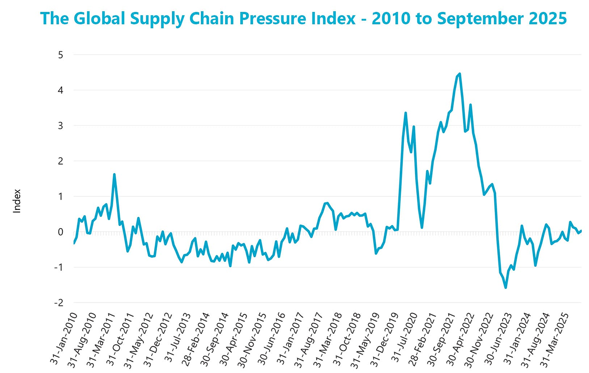 Supply chain stress reached a peak in 2021. Although it has maintained low levels through September 2025, it’s likely to increase into 2026. Source: Federal Reserve Bank of New York, Global Supply Chain Pressure Index