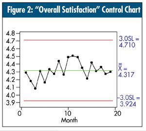 Figure 1 shows one clinic’s “overall satisfaction” results for 19 months, and figure 2 shows the resulting control chart, which the outside firm didn’t supply. It only compared the current month with the previous month and looked for “short-term trends.”