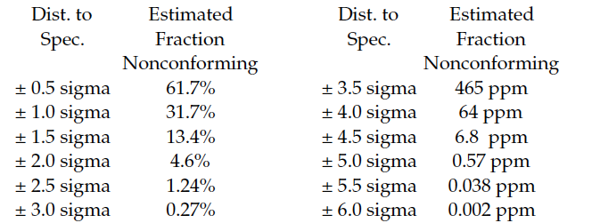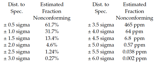 The sigma levels commonly quoted in Six Sigma training classes are shifted 1.5 sigma relative to those in Figure 1. For example, a “Six Sigma” process is said to be producing no more than 6.8 ppm nonconforming. This 1.5 sigma shift is said to allow for an unpredictable process. However, this claim is completely without foundation in either theory or practice. When a process is operated unpredictably, there is no magic-sized shift that can compensate for the unplanned process changes.