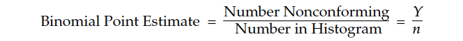If we try to estimate proportions that correspond to values beyond the last point in our histogram, the point binomial estimate becomes zero, and the 95% A–C interval estimate formula for the upper bound on the fraction nonconforming becomes a function of how many data are being used: