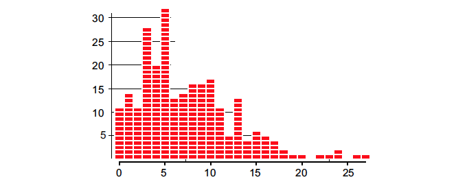 To illustrate this point, consider the 250 values in Figure 2. This histogram has an average of 7.4 and a standard deviation of 5.2. Clearly these data have a boundary condition on the left, resulting in a skewed histogram.