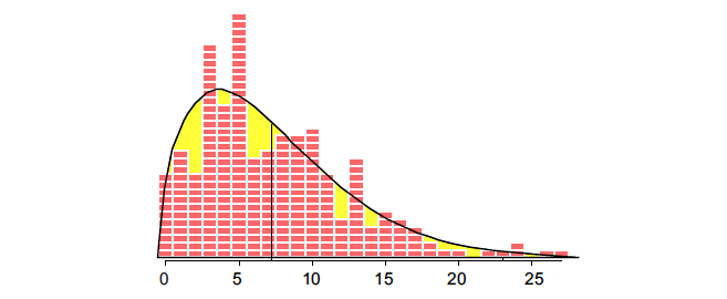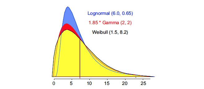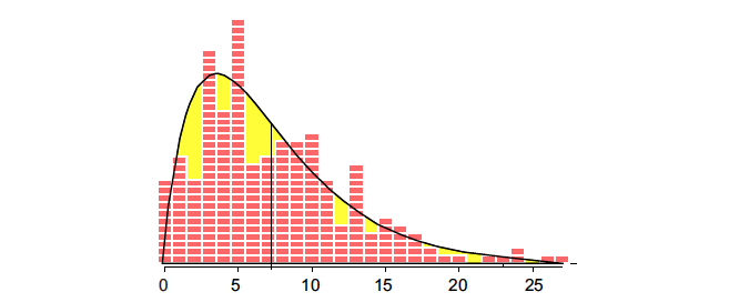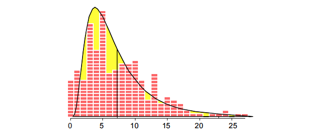 A gamma distribution with alpha = 2 and beta = 2 (also known as a Chi-square distribution with four degrees of freedom) has a mean of 4 and a standard deviation of 2.828. When we stretch this distribution out 185%, we get a distribution with a mean of 7.4 and a standard deviation of 5.23, which results in the fitted model shown in Figure 4.