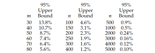 When you estimate the fraction nonconforming, you’re making a prediction. And the upper bound above defines the inherent uncertainty in that prediction. Figure 7 lists these upper bounds on the estimated fraction nonconforming when the binomial point estimate is zero.