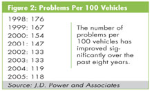 Power's most recent reports bear this out: There is now virtually no significant difference in the Initial Quality Studies of problems per 100 vehicles (PP100) between Big Three and Asian-made cars. The entire industry, in fact, has made progress in reducing defects and improving quality. As can be seen in figure 2, between 1998 and 2005, the industrywide average number of PP100 across all makes and models dropped steadily, from 176 to 118.