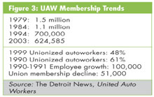 The effects of North American autoworker unionization can't be understated. Membership in the UAW has decreased sharply since its heyday in the late 1970s, when it claimed 1.5 million members. As of 2003, there were just 624,585 UAW members. Unions represented 48 percent of U.S. autoworkers in 1999, down from 61 percent at the beginning of the decade. Although auto industry employment grew by more than 100,000 in the 1990s, the number of union members dropped by 51,000. The UAW has acknowledged the decline in union density, which can be seen in figure 3.