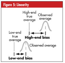 • Linearity. Linearity is the difference in the bias (i.e., accuracy) values through the gauge’s estimated operating range, as seen in figure 5, right.