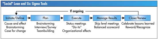 Although the list of lean and Six Sigma tools noted previously helps in executing the technical side of project management, a lean PM must have an arsenal of "social" tools as well. Some examples are listed in the figure above.