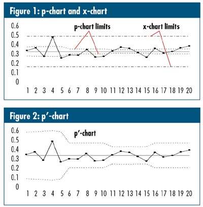 Figure 1 shows traditional p-chart and XmR chart renderings of a data set that suffers from overdispersion. Figure 2 shows the same data in a p'-chart. Note that these limits are "out where they should be" as suggested by the XmR chart, and they "wiggle," as in the p-chart, in response to unequal subgroup sizes. It can be shown that if a data set really is purely binomially distributed, the p'-chart is exactly the same as a p-chart. Also, if all subgroup sizes are the same, the p'-chart is exactly the same as the XmR chart.