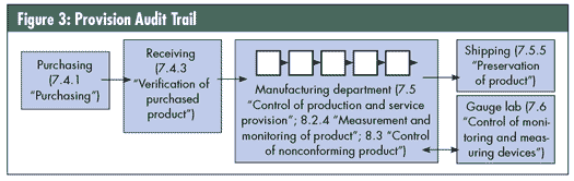 As seen in the flowchart in figure 3, the provision audit trail covers all the activities necessary to produce and deliver products and services to the customer. It includes activities for operating the realization processes, identifying and tracing products and services, handling customer property, preserving product, measuring product and service output, and handling nonconforming product.