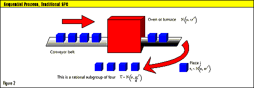 The rational subgroup should be a random sample of the process’s overall performance. A sample of four pieces from a batch is not a sample of the overall process; it’s a sample of one batch and reflects only the within-batch variation, or batch uniformity. A batch or run, not a single part, counts as one independent measurement of the overall process (see Figure 1). If, however, the pieces go through a furnace on a conveyor belt, each piece is an independent measurement of the overall process (see Figure 2). N(u, sigma-squared) means “normal distribution with mean u and variance sigma-squared.” Under these conditions, traditional SPC should work properly.