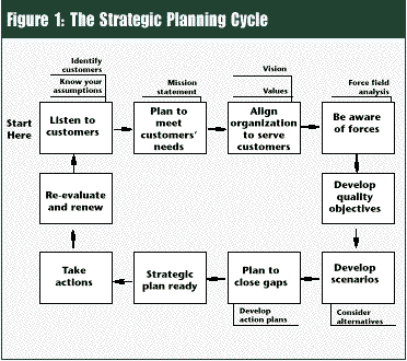 In almost any endeavor, quality can serve as a core value that sets the expectations for performance. For a community, the issue may be the quality of living. For a business, it may be the quality of products or services, or work life within an organization. In health care, quality might focus on correct diagnosis and treatment of illnesses. And quality is a key factor for nonprofit organizations in their ability to achieve their missions. In each case, a process exists for synthesizing strategic planning and quality. While people often have an intuitive grasp of quality’s importance in an organization’s goals, they may not know the specific steps they can take to bring quality into clear focus. The steps discussed below will enhance an organization’s ability to create the quality future its leaders, customers and employees seek. Outlining the process Several broad steps comprise the strategic planning process for any organization (see Figure 1). The process always begins with the customers in mind: who these customers are, what they want and what trends will impact them in the future. Having established the customers’ perspective, an organization must determine where it should be in relation to its customers. Should it keep the same ones? Expand into new customer areas? Give up, maintain or expand market positions? Quality should be a major factor in answering these questions. A successful organization will focus on its areas of excellence, where it provides high-quality service and products to customers in the most profitable manner. Endeavors where quality is low, scrap costs are high or customers have complaints must either be targeted for change or abandoned as untenable. When an organization has clarified its position regarding its customers, it should next work on internal vision. An organization’s structure may need to change in order to achieve the desired outcome. At this time, the organization’s planners also must attend to the trends and future conditions that will impact the organization. Depending upon the organization’s mission, demographic studies, long-term economic forecasts, technical projections and a quick review of the company’s history all can help assess the future. Once the planners envision what the organization will become, they must identify where the organization is in relation to where it wants to be. Planners then should determine the specific steps required to get there. This often becomes the hardest part of the planning process. Numerous day-to-day forces will divert attention and resources away from the strategic plan. Ingrained behaviors must be resisted in order to take new steps toward achieving the vision. Implementing the steps in the plan means taking action and assessing its effectiveness. Undoubtedly, any change will meet with resistance, which must be overcome. Periodic reassessments of the strategic plan will be necessary to ensure the vision is still accurate. As demonstrated in Figure 1, the strategic planning process becomes a cycle within the organization. Creating a planning team An organization’s management must initiate the strategic planning process and make sure it continues. However, the actual planning is best carried out by a team, ideally a diagonal cross-section of people within the organization to ensure that all interests are met. Such a team also provides the best information about what is really happening in the organization. A planning team consisting of only senior-level managers runs the risk of filtering out vital information and perspectives from middle levels and those who perform hands-on work or have direct contact with customers. At the same time, the team must have senior-level people who can provide a broad view of the organization’s situation. For example, the Cadillac Quality Council is co-chaired by an international representative of the United Auto Workers and involves people from a broad range of perspectives. In small organizations, it may be possible to assemble everybody in one room at the same time. A facilitator can lead the process and aim for total involvement and commitment from the whole group. In large businesses, the planning team must include senior and middle management, front-line supervision and people who work directly on production or with customers. If the organization has a union, then union leaders also should be invited to participate in the process. In social service organizations, managers and service providers must be involved, along with people who can speak for the service recipients -- i.e., the customers. The quality of the planning process is enhanced by the planning group’s diversity. Care must be taken to ensure that a planning team is diverse, within the context of the organization. An effective team will offer a balance of perspectives from within and without the organization. It’s important to include perspectives from men and women, newcomers and established employees, people from different racial or ethnic backgrounds, and different age groups. The plan’s validity is strengthened by the assurance that all perspectives are involved in the creative process. The quality manager’s role While an organization’s senior managers typically are responsible for achieving the organization’s mission -- and thereby its standards for quality -- many organizations now employ quality managers. The quality manager’s role varies greatly from one organization to the next. In successful organizations, the quality manager works closely with senior managers and serves as a vocal proponent for quality. He or she should be a key player in the organization’s strategic planning by championing the process. Examples abound of successful organizations in which the quality manager plays a strong role as quality advocate among the senior managers. At the Ritz-Carlton Hotel Co., a 1992 Baldrige Award winner, the vice president of quality drives the quality emphasis. At Xe
