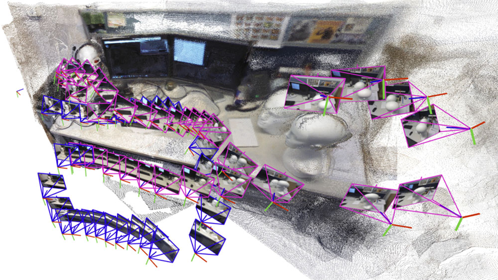 The artificial intelligence-driven system incrementally creates and aligns smaller submaps of the scene that it stitches together to reconstruct a full 3D map (like this office cubicle) while estimating the robot’s position in real time.