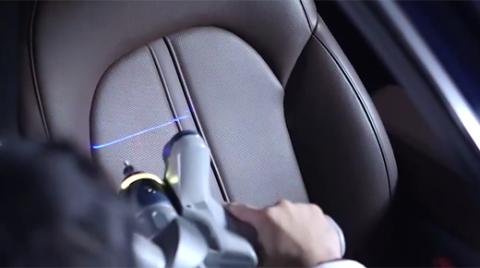 Dirk Noffke, a metrology technician at DaimlerChrysler Bremen, inspects the dimensional accuracy of the left fender on a Mercedes SLK body-in-white. The comparison between the actual and CAD data is displayed in real time on an application PC running…